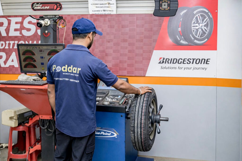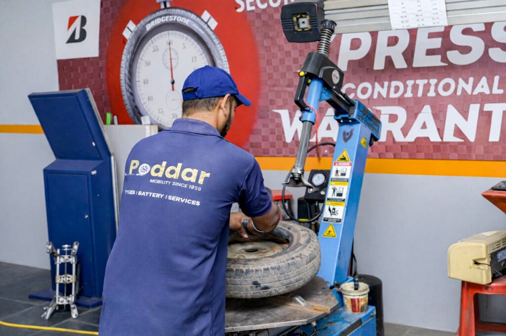Poddar Tyres Jajpur Road, Jajpur is a multi-vehicle tyre shop serving 2-wheelers, passenger cars and commercial vehicles on Jajpur Road, Jajpur, Odisha. Services include new tyre, tube and flap sales (2W, 4W, CV), wheel balancing, wheel alignment, tyre rotation, nitrogen inflation, tyre counselling, puncture repair, tyre service packages for 4W and CV, and wheel valve stem. Also offers tyre retread, vehicle insurance, scrapping (RVSF), MyTVS accessories and Power Zone batteries. Trusted tyre shop in Jajpur since 1959.